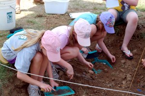 And the first day, it did! Gracious volunteers and a fabulous director prepped our freshly dug archaeological “excavation”, and the kids were eager to get in that dirt and dig. After a lesson on the basics of archaeology, we headed out to our “site”, Rome, and got to it. The kids were a bit hasty and sometimes did not use exactly the proper techniques of a “real” archaeologist, but at least they were getting some good information about how we learn new things without text documents, stratigraphy, and excavations.