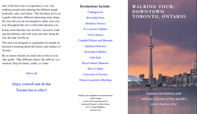 This guide serves as a guide to several culturally and historically interesting places but also encourages students to make their own route. I chose places for this walking tour that would appeal to a variety of students. The sites visited include government buildings, universities, ethnic and cultural neighborhoods, a museum, a historic house, and city parks. The brochure also includes official links for the sites that are included so that when the guide is distributed online students and others can learn more about the places they will visit on the tour. The distance and time that it would take to visit these sites may seem excessive, but the group of six that I was a part of managed this and more in our time in Toronto. Public transportation is also an option for students who may not want to experience the entire city via foot.