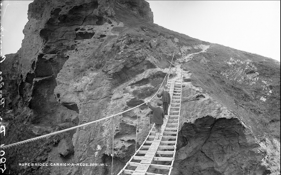 Our next stop was the National Trust site, Carrick-a-Rede rope bridge. The bridge has been around, in some form or another for at least 300 years. Salmon fishermen built the bridge to get across the gorge onto the smaller islands. It hangs 98 feet over the rocks and spans 66 feet. Until the 1970s, the bridge had only one handrail and huge gaps between slats as seen in the picture to the left. That picture (c. 1890s) comes from The National Library of Ireland on The Commons Flickr account, which has a multitude of amazing historic photographs from Irish history. Beware – if you’re into that kind of thing, it can be addictive!