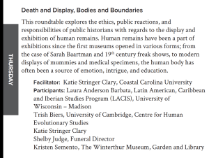 ↠ Stringer Clary, Katie. ““Historical Contexts of Bodies, Display, and Spectacle.” in Museums, Heritage and Death. Routledge Companion Series. Oxford: Routledge, TBD.