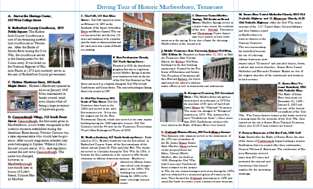 Historic Murfreesboro Driving Tour This project was completed with partner, Rebecca Duke. Click here for a PDF of the Driving Tour. Share this: Click to share on X (Opens in new window) X Click to share on Facebook (Opens in new window) Facebook Click to email a link to a friend (Opens in new window) Email Click to print (Opens in new window) Print Click to share on Pinterest (Opens in new window) Pinterest Click to share on LinkedIn (Opens in new window) LinkedIn Click to share on Tumblr (Opens in new window) Tumblr Click to share on Reddit (Opens in new window) Reddit Like Loading...